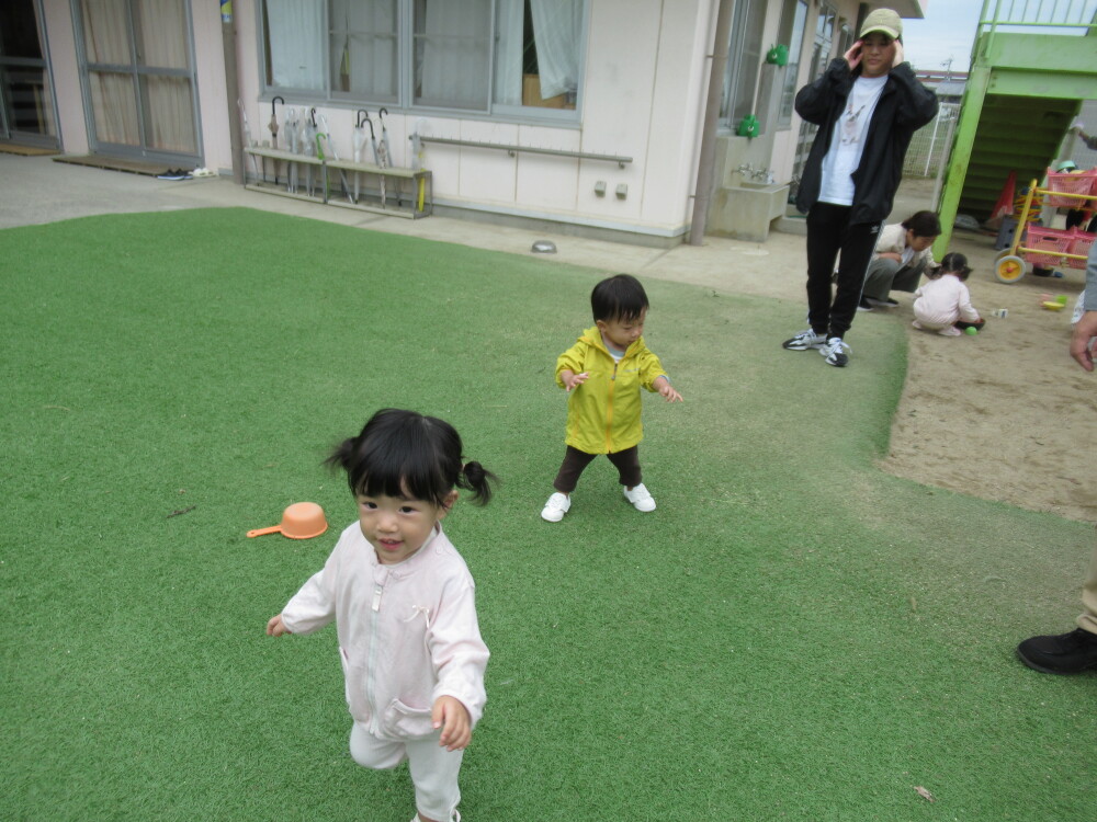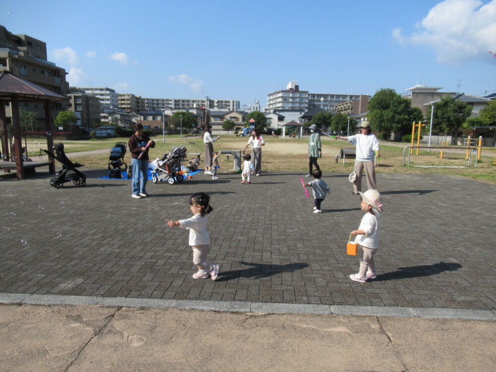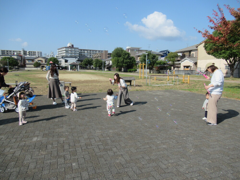 しゃぼん玉遊び。ママが飛ばしてくれたしゃぼん玉をみんなで追いかける姿はとても可愛かったです。