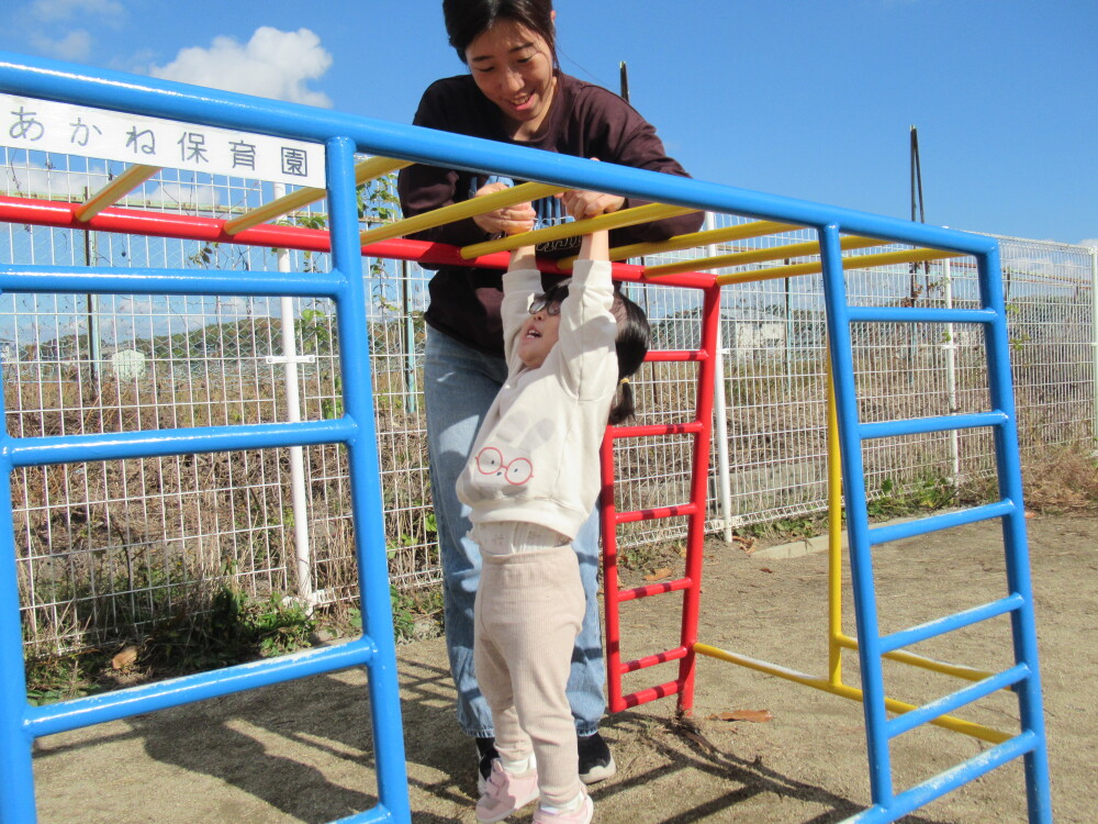 うんていでは、登ってみたり、ぶら下がってみたり、一緒に遊ぶことができました。
