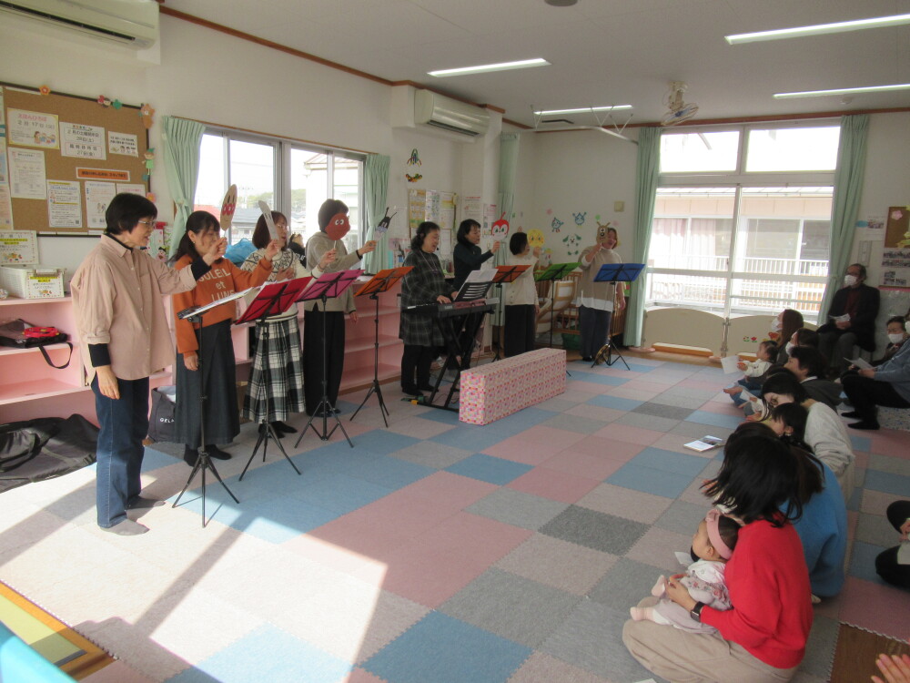 ご用意くださったのは目で見ても楽しいプログラム。「手のひらを太陽に」などの名曲や季節の童謡に合わせて楽しいペープサートや小道具も登場しました。