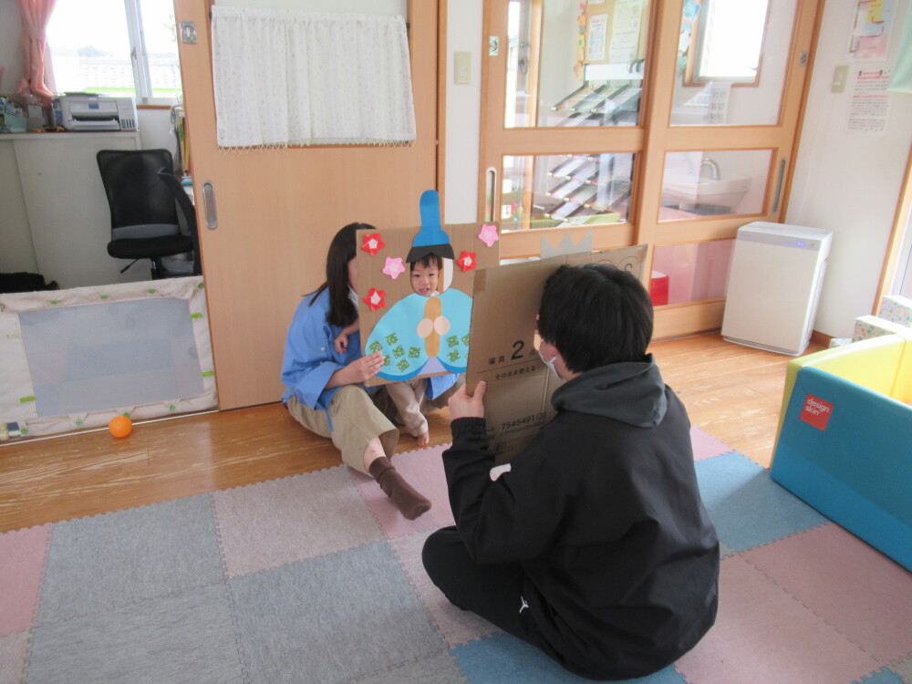 はじめにスケッチブックシアターを見ながらひなまつりのお話を聞き、みんなで「うれしいひなまつり」の歌を歌いました。