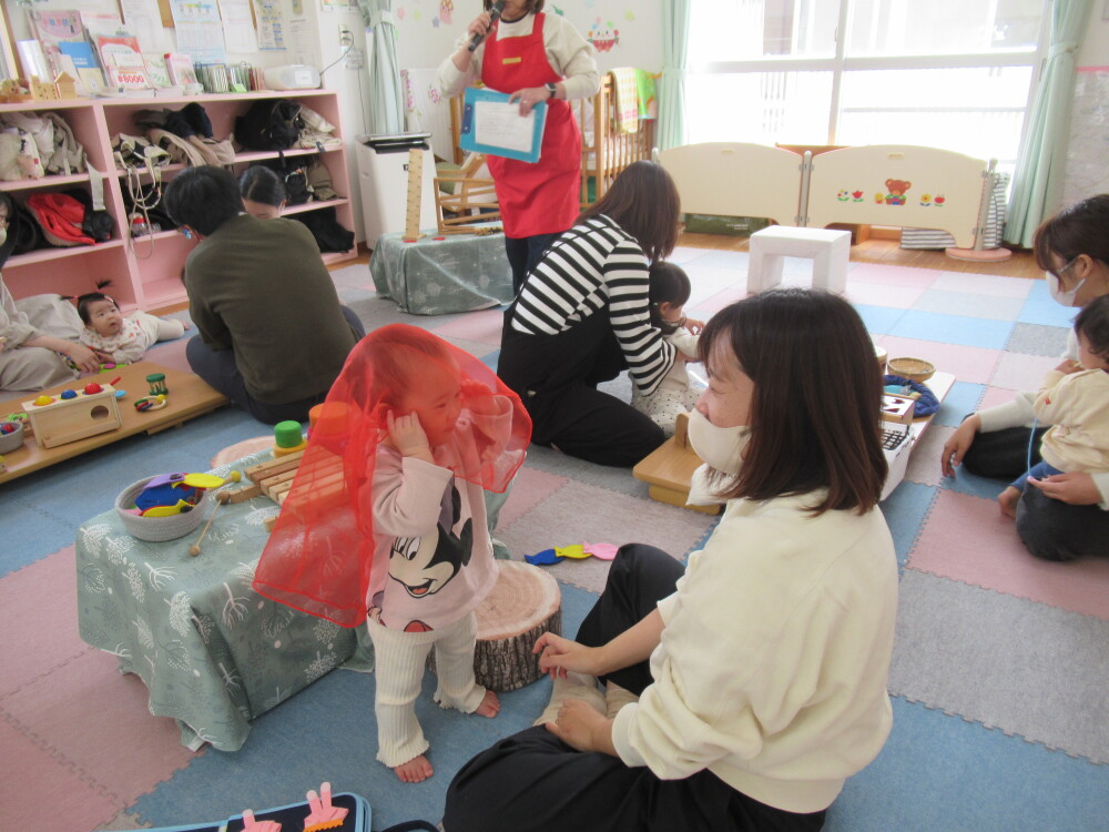 シフォンで「いないいないばあ」してみせると、まねっこしてやってみるかわいい姿があちこちで見られました。