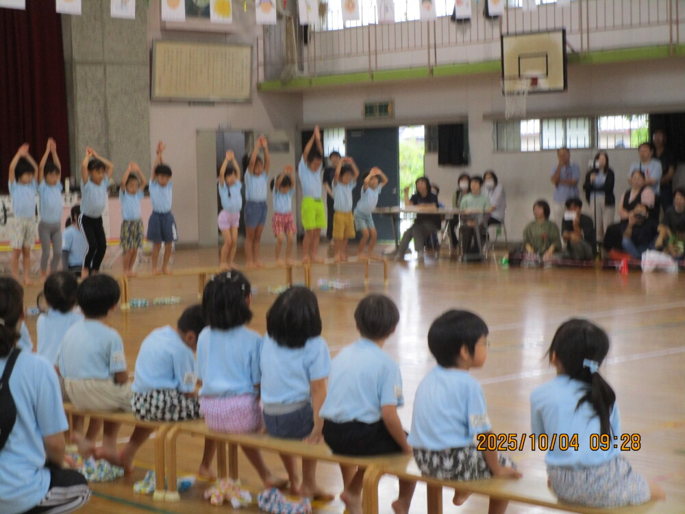 体育競技は普段から取り組んでいる体育あそびの延長として楽しみつつ、それぞれの子どもに合わせて少し難しいことにもチャレンジしました。5歳児クラスでは竹登りもあり、その身体能力は圧巻でした。リズムは0歳児から楽しんでいる活動で、今回は3・4歳児は異年齢リズム、5歳児は縄跳びを使ったリズムでした。体を存分に使って表現することを楽しみ、仲間と一緒に!という気持ちが表れているのが印象的でした。