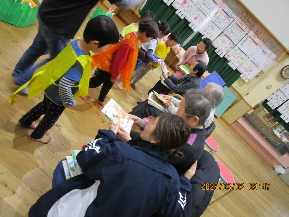 劇遊びの内容は、絵本「いつまでもともだち」です。森の動物たちが音楽会のために一生懸命練習をするなかで、ある出来事が起こり・・・ハートウォーミングなクライマックスを迎えます。5歳児さんもあと少しで離れ離れになるけれど、『いつまでもともだちだよ』という思いを劇あそびに重ねています。発表の場が延びて練習ができた分、どんどんと素敵な劇に仕上がり、「保育園以外の方にもお見せしたい!」ということで、同法人の高齢者施設の方をご招待することになりました。快くお受けいただき3月2日に発表しました。観客席で身振り手振りで参加されたり、感動して涙されており、子ども達にとって心温まる時間になったと思います。そして、お礼の絵本をプレゼントしていただきました。
