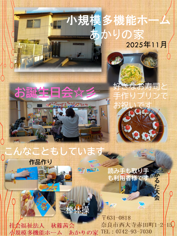 11月のお誕生日会は、ご家族様にも参加していただき一緒にお祝いをしました。職員からのメッセージカードをお渡しし、うたを歌ってお祝いをしました。