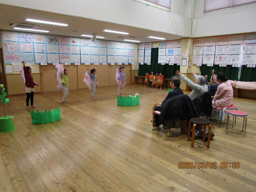 劇遊びの内容は、絵本「いつまでもともだち」です。森の動物たちが音楽会のために一生懸命練習をするなかで、ある出来事が起こり・・・ハートウォーミングなクライマックスを迎えます。5歳児さんもあと少しで離れ離れになるけれど、『いつまでもともだちだよ』という思いを劇あそびに重ねています。発表の場が延びて練習ができた分、どんどんと素敵な劇に仕上がり、「保育園以外の方にもお見せしたい!」ということで、同法人の高齢者施設の方をご招待することになりました。快くお受けいただき3月2日に発表しました。観客席で身振り手振りで参加されたり、感動して涙されており、子ども達にとって心温まる時間になったと思います。そして、お礼の絵本をプレゼントしていただきました。