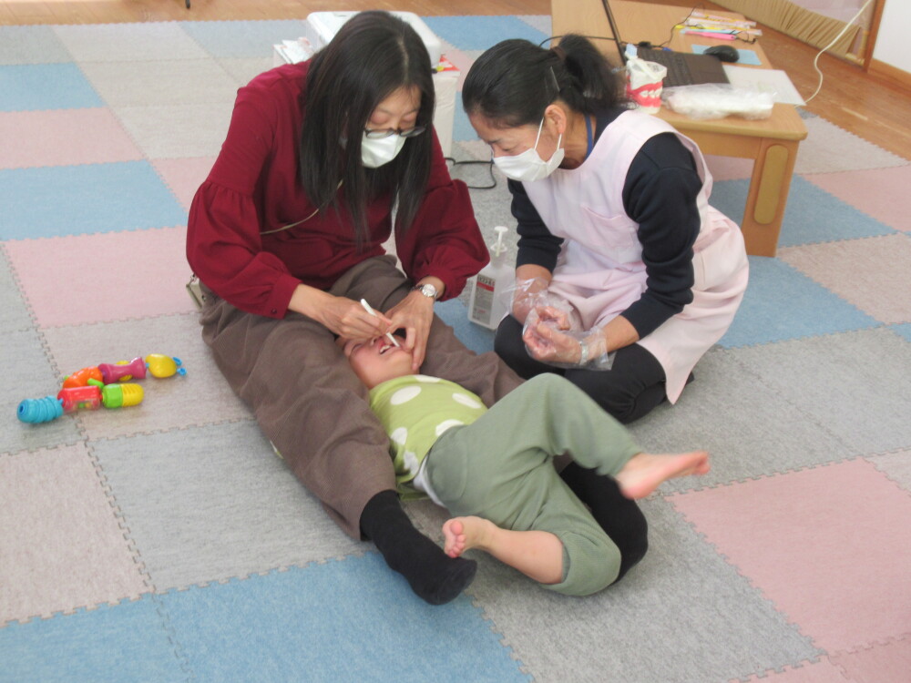 今回、ガーゼ磨きの子は一人だけでした。その子以外はもう歯ブラシを使って磨いていたので、