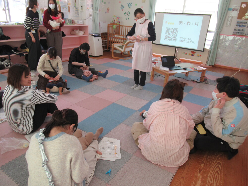 講師は、奈良市南消防署西大寺分署の方にお願いして、いざという時に子どもの命を守るために、乳幼児の思わぬ事故への対応を教えてもらいました。