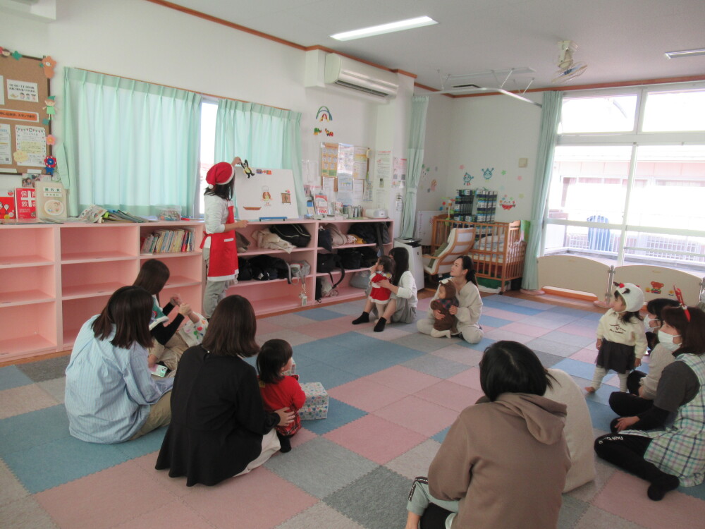 最後は、紙皿シアターを見たり、「どんぐりころちゃん」のふれあい遊びをしました。
