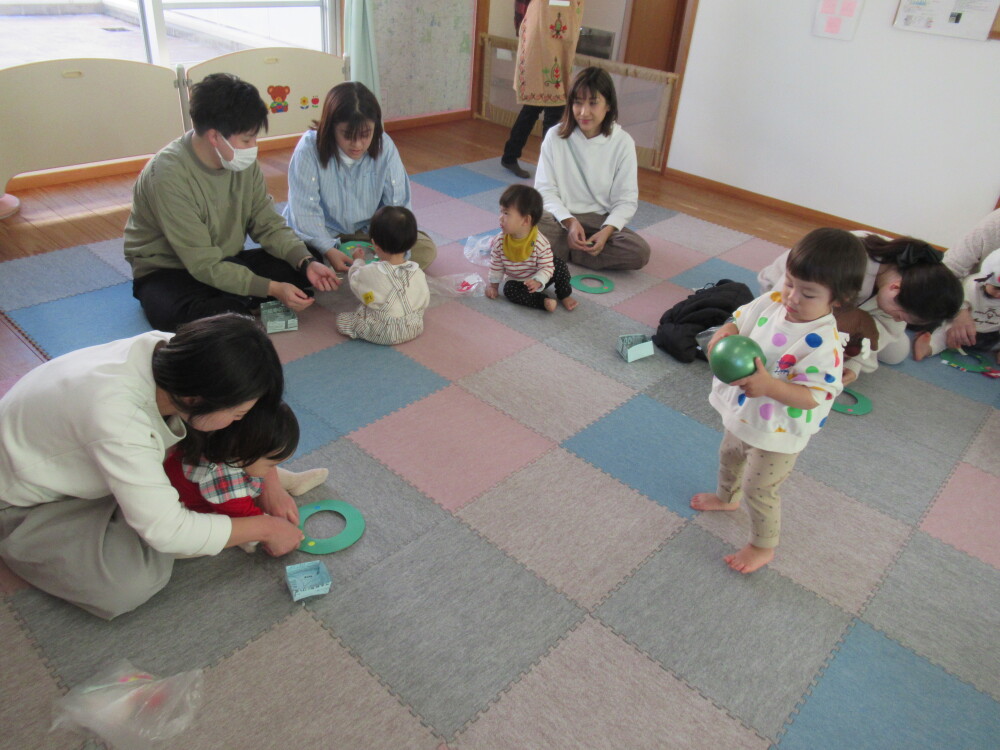 まずはママの膝の上での活動からスタート。「かえるのうた」に合わせてリズムをとりました。ぴょーんと持ち上げてもらって、子ども達もニコニコ。
