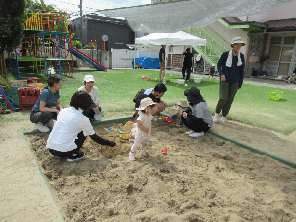 今日、生まれて初めて砂場遊びをしたお子さんも、砂をにぎったり、ばらまいたり、お山をつぶしてみたりして、砂の感触を楽しんでくれました。途中、砂のついたおててをお口に入れてしまうハプニングもありましたが、お口をきれいにしてもらうと、また再び、砂場で遊び、水の入った容器にも興味を示して、自ら手を入れたりして、水の感触も楽しめました。