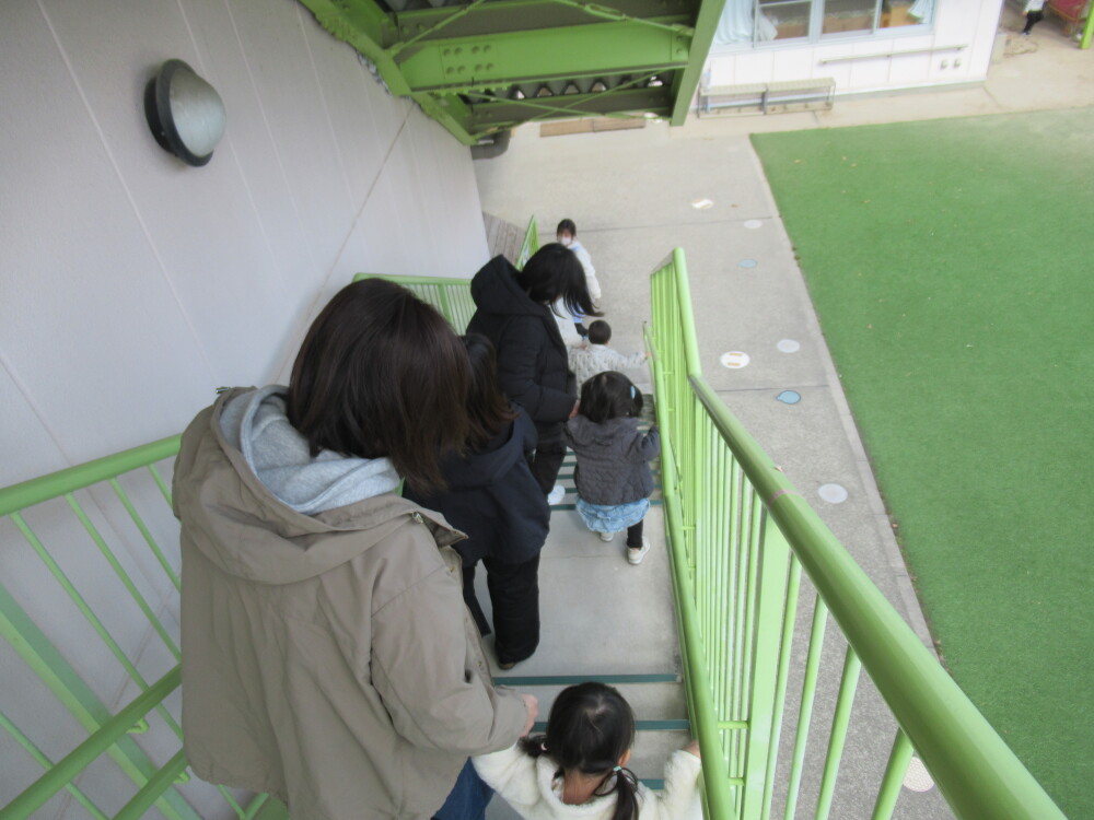 保育室の横を通り、初めての階段から園庭に避難しました。